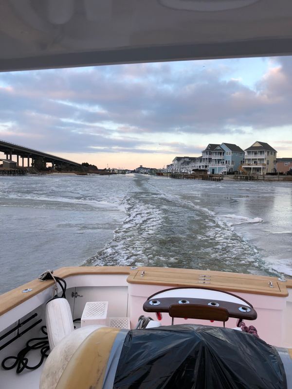 Joe & I, along with another boat, left Manteo on Tuesday but got fouled up in the ice…. went back….. tried again yesterday...wanting to get below the ice belt.... busted thru ice from Manteo past Wanchese (5 miles)…. got to Morehead City  just before the weather turned awful…. needed to get away from ice back home… more current and tide and salinity here…. no ice…. gale winds today so we  spent all day  busting snow  & ice off this rig…. them boats in Alaska use mallats and shovels to de-ice their rigs….. we used squeegees and dust pans and brushes... don't work as well…. not equipped for this….. still breezy and cold tomorrow, so we are hoping to hug the coast  and get to Southport….. maybe moderate winds Saturday and we get to Florida….. Wouldn’t want it to be too easy…... that first margarita is sure gonna taste good!!!!