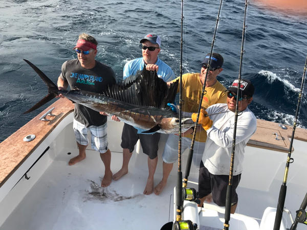 TWO GREAT DAYS ON THEIR FIRST TRIP TO ISLA MUJERES On Monday Jon & Jennifer Sage from Charlotte NC, along with Jon, Jay and Allison, from Indiana caught 15 sailfish and today the guys went again and caught 15 more... ending the day with a triple header.
