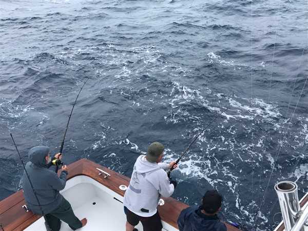 FINALLY SOME NICE WEATHER    Tom & Mike, from PA, on their third of 5 days finally had some relatively docile seas and continued good fishing close to home.... started the day strong with a double &  triple header, then a slow mid day, but a strong finish with another triple header and home at sunset for some Cactus Juice!