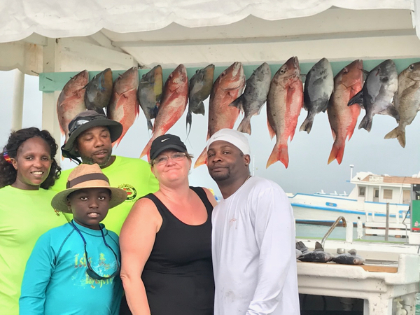 TRA, DOUG, REGGIE, SUSAN SND CHARLIE WITH ONE OF 21 SAILS THEY CAUGHT WITH US IN TWO DAYS